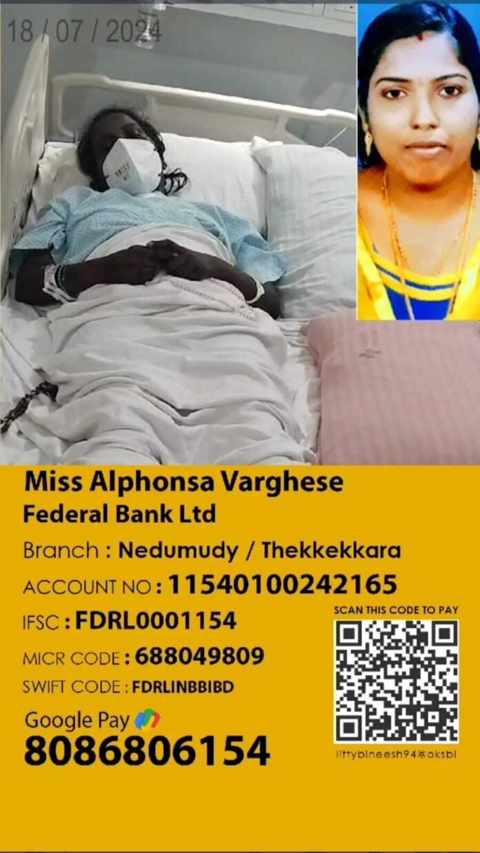 ആലപ്പുഴ: ചമ്പക്കുളം 13 -ആം വാർഡിലെ നരിമീൻകുന്ന് ബിനീഷിന്റെ ഭാര്യ അൽഫോൺസക്ക് അണുബാധ മൂലം കാലുകളിലെ 10 വിരലുകളും ശസ്ത്രക്രിയയിലൂടെ മുറിച്ചു മാറ്റിയിരിക്കുകയാണ്. വൃക്കകൾ തകരാറാറിലായി. ഇപ്പോൾ ചികിത്സയിലൂടെ പ്രവർത്തനത്തിലേക്ക് വന്നിട്ടുണ്ട്. ഇനി കൈ വിരലുകൾ മുറിച്ചു മാറ്റപ്പെടാതിരിക്കണമെങ്കിൽ, ജീവിതത്തിലേക്ക് തിരിച്ചുവരണമെങ്കിൽ ചികിൽസിക്കുന്നതിനു ഭീമമായ തുക വേണ്ടി വരും. 35 ലക്ഷം രൂപ ഇനി ചികിത്സക്ക് ആവശ്യമായി വേണ്ടി വരും.