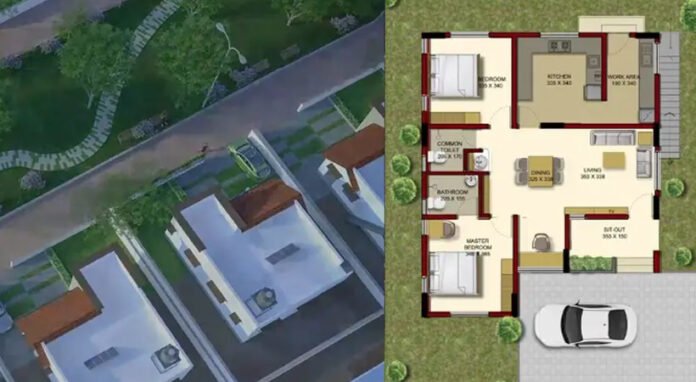 വീട്ടിൽ ഒരുക്കുന്നത് രണ്ട് ബെഡ്റൂമുകൾ, മാസ്റ്റർ ബെഡ്റൂം- 340 x 365, രണ്ടാമത്തെ ബെഡ്റൂം – 335 x 340, ഡൈനിങ് 325 x 338, ലിവിങ്  353 x 338, സിറ്റൗട്ട് – 353 x 150, കിച്ചൺ 335 X 340, ബാത്ത് റൂം 205 x 155, കോമൺ ടോയ്ലറ്റ് 205 x 170,വർക്ക് ഏരിയ 190x 340 എന്നിങ്ങനെയാണ്.