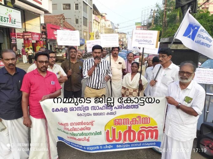 കോട്ടയം: കേന്ദ്ര ഗവൺമെൻ്റ് നടപ്പിലാക്കിയ ഔഷധ വില വർദ്ധനവിൽ പ്രതിഷേധിച്ച് കേരള ശാസ്ത്ര സാഹിത്യ പരിഷത്ത് മേഖലാ കമ്മറ്റിയുടെ ആഭിമുഖ്യത്തിൽ കോട്ടയം ഗാന്ധി സ്ക്വയറിൽ ജനകീയ ധർണ്ണ സംഘടിപ്പിച്ചു. ധർണ്ണ കെ.എം എസ് ആർ എ ജില്ലാ സെക്രട്ടറി റിയാസ് റഹ്മാൻ ഉദ്ഘാടനം ചെയ്തു. മേഖല പ്രസിഡൻ്റ്പി എം അനിൽ അദ്ധ്യക്ഷത വഹിച്ച ധർണ്ണയിൽ പരിഷത്ത് ജില്ലാ സെക്രട്ടറി വിജു കെ നായർ മുഖ്യപ്രഭാഷണം നടത്തി. കെ ജി എൻ എ സംസ്ഥാന കമ്മറ്റിയംഗം രാജൂ വി ആർ, മേഖലാ സെകട്ടറി എസ്.ഡി പ്രേംജി, പരിഷത്ത്ജില്ലാ കമ്മറ്റിയംഗങ്ങളായ മഹേഷ് ബാബു, സി ശശി, ജിഷാ മേരി മാത്യു, ജില്ലാ വൈസ് പ്രസിഡന്റ് പി എൻ കേശവൻ , റ്റി.എസ് വിജയകുമാർ , എ പി.സലിമോൻ,