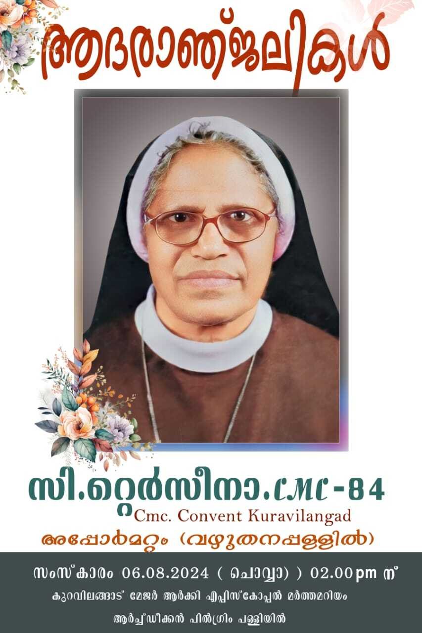 കുറവിലങ്ങാട് കർമ്മലീത്താ മഠാംഗമായ സിസ്റ്റർ ടെർസീന നിര്യാതയായി . സംസ്കാരകർമ്മങ്ങൾ നാളെ 6/8/2024 ചൊവ്വ 2 pm ന് വിശുദ്ധ കുർബാനയോട് കൂടി മഠം ചാപ്പലിൽ ആരംഭിക്കുന്നതും തുടർന്ന് കുറവിലങ്ങാട് മേജർ ആർക്കി എപ്പിസ്കോപ്പൽ മർത്തമറിയം ആർച്ച് ഡീക്കൻ തീർത്ഥാടന ദൈവാലയ സെമിത്തേരിയിൽ സംസ്കരിക്കുന്നതുമാണ്.
