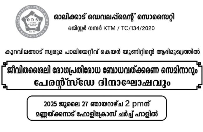മണ്ണയ്ക്കനാട്:ഓലിക്കാട് ഡെവലപ്പ്മെന്റ് സൊസൈറ്റി കുറവിലങ്ങാട് സ്വരുമ പാലിയേറ്റീവ് കെയർ യൂണിറ്റിൻ്റെ സഹകരണത്തോടെ സംഘടിപ്പിയ്ക്കുന്ന ജീവിതശൈലി രോഗപ്രതിരോധ ബോധവത്ക്കരണ സെമിനാറും പേരന്റ്സ്ഡേ ദിനാഘോഷവും നാളെ