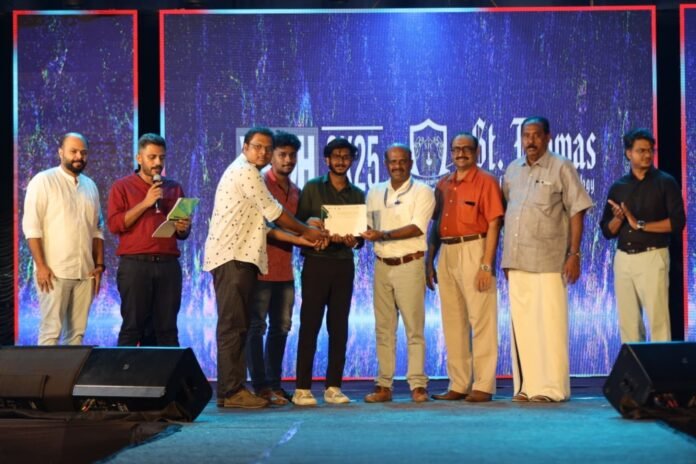 ചെങ്ങന്നൂരിലെ സെന്റ് തോമസ് കോളേജ് ഓഫ് എഞ്ചിനീയറിംഗ് ആൻഡ് ടെക്നോളജിയിൽ നടന്ന ഡെക്കത്തോൺ 3.0 – ഇന്തോ – മലേഷ്യൻ ഇന്റർനാഷണൽ ഹാക്കത്തോണിൽ രണ്ടാം വർഷ എഐഎംഎൽ വിദ്യാർത്ഥികളായ ശിവ ദീപക് എംബി, അഭിഷേക് ജെ പി, സിമോയ് രാജൻ എന്നിവർ “മികച്ച പ്രോട്ടോടൈപ്പ്” അവാർഡ് സ്വീകരിക്കുന്നു.