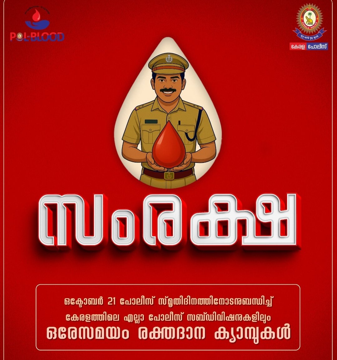 കേരള പോലീസിന്റെ ‘സംരക്ഷ’ രക്തദാന ക്യാമ്പുകൾ ഒക്ടോബർ 21-ന് സംസ്ഥാന പോലീസ് മേധാവി റവാഡ എ ചന്ദ്ര ശേഖർ ഐ പി എസ് ഉദ്ഘാടനം ചെയ്യും.