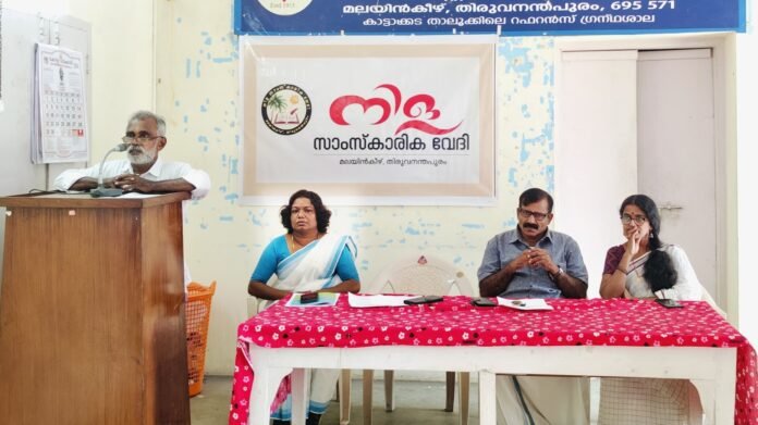 നിള സാംസ്കാരികവേദി വൈസ് പ്രസിഡന്റ് രാജേന്ദ്രന് ശിവഗംഗ അധ്യക്ഷനായി. ചടങ്ങില് മുന്ഷി രാജേന്ദ്രന്, ഗോപന് കൂട്ടപ്പന, ഷെല്ലിവൈഗ, കൃഷ്ണമ്മ എന്നിവരെ ആദരിച്ചു. നിള സാംസ്കാരിക വേദി സെക്രട്ടറി പ്രിയാശ്യാം, കെ.ബീന, രഞ്ജിത്ത് പേയാട്, രാജലക്ഷ്മി എന്.മാറനല്ലൂര് എന്നിവര് സംസാരിച്ചു. തുടര്ന്ന് വിവിധ കലാപരിപാടികളും നാടന്പാട്ടുകലാകാരി കൃഷ്ണമ്മയുടെ നൃത്തവും മധുരവിതരണവും നടന്നു.