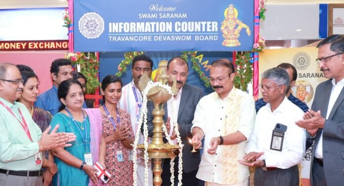 ചെങ്ങമനാട്: നെടുമ്പാശ്ശേരി അന്താരാഷ്ട്ര വിമാനത്താവളത്തിൽ തിരുവിതാംകൂർ ദേവസ്വം ബോർഡിന്റെ ശബരിമല ഇൻഫർമേഷൻ സെന്റർ പ്രവർത്തനം ആരംഭിച്ചു. ആഭ്യന്തര ടെർമിനൽ ( ടി – 1) ആഗമന ഭാഗത്താണ് കൗണ്ടർ ആരംഭിച്ച സെന്റർ തിരുവിതാംകൂർ ദേവസ്വം പ്രസിഡന്റ് അഡ്വ. പി. എസ്. പ്രശാന്ത് ഉദ്ഘാടനം ചെയ്തു. ശബരിമല തീർത്ഥാടകർക്കും ഭക്തർക്കും 24 മണിക്കൂറും ഇവിടെ സേവനം ലഭ്യമാകും.