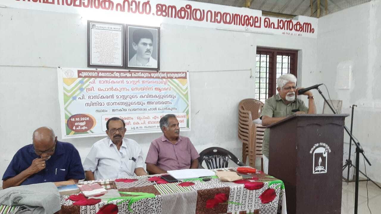 പി ഭാസ്കരൻ മാസ്റ്റർ ജന്മശതാബ്ദിയുടെ ഭാഗമായി പുരോഗമന കലാസാഹിത്യ സംഘം പൊൻകുന്നം യൂണിറ്റിൻ്റെ ആഭിമുഖ്യത്തിൽ അനുസ്മരണ യോഗവും അദ്ദേഹത്തിൻ്റെ കവിതകളുടെയും സിനിമാഗാനങ്ങളുടെയും ആലാപനവും നടത്തി. എം എൻ രാധാകൃഷ്ണൻ്റെ അദ്ധ്യക്ഷതയിൽ കൂടിയ യോഗത്തിന് സെക്രട്ടറി പി എൻ സോജൻ സ്വാഗതം ആശംസിച്ചു. പ്രൊഫ. എം ജി ചന്ദ്രശേഖരൻ അനുസ്മരണ പ്രഭാഷണം നടത്തി. സംസ്ഥാനത്തെ മികച്ച ഗ്രന്ഥശാലാ പ്രവർത്തകനുള്ള പി എൻ പണിക്കർ പുരസ്കാരം നേടിയ പൊൻകുന്നം സെയ്ദിനെ പു ക സ സംസ്ഥാന കൗൺസിൽ അംഗം കെ പി ബാലഗോപാലൻ നായർ പൊന്നാട അണിയിച്ച് ആദരിച്ചു. രാജ്മോഹൻ പി സി , സാജൻ കെ കെ, രാജീവ് കെ എൻ , സജിമോൻ എം ടി ,സന്തോഷ് വി കെ , വി എം തങ്കച്ചൻ, പി എൻ സോജൻ എന്നിവർ അദ്ദേഹത്തിൻ്റെ സിനിമാഗാനങ്ങളും ഗോപിക സന്തോഷ്, എം എൻ രാധാകൃഷ്ണൻ എന്നിവർ അദ്ദേഹത്തിൻ്റെ കവിതകളും ആലപിച്ചു. സുജേഷ് ടി ശ്രീനിവാസ് കൃതജ്ഞതയും പറഞ്ഞു.