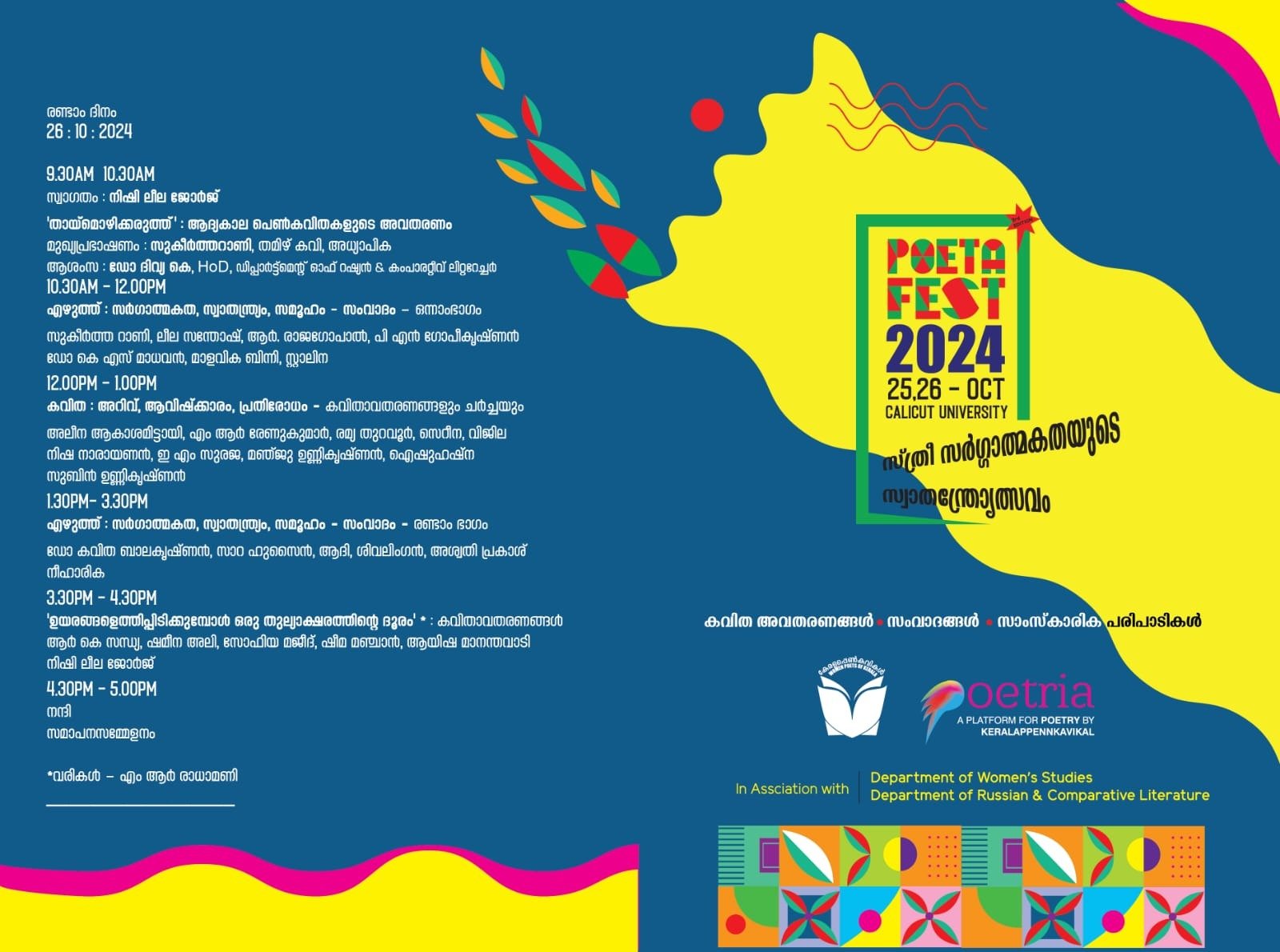 ‘കേരളപ്പെൺകവികൾ’ – ദ വിമെൻ പോയറ്റ്സ് ഫോറം ഓഫ് കേരളയുടെ സാഹിത്യോത്സവമായ ‘പോയറ്റ ഫെസ്റ്റ് 2024’ -ന് കാലിക്കറ്റ് യൂണിവേഴ്സിറ്റിയിൽ വേദിയൊരുങ്ങുന്നു.