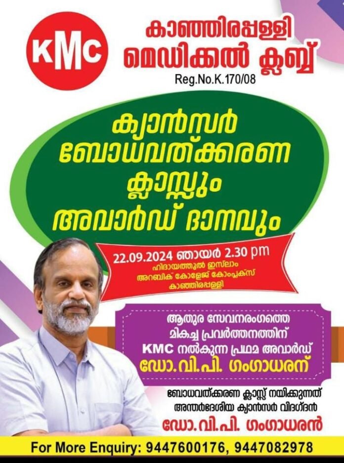 കാഞ്ഞിരപ്പള്ളി: ലോക പ്രശസ്ത ക്യാൻസർ രോഗ ചികിത്സകൻ ഡോ.വി.പി.ഗംഗാധരൻ നയിക്കുന്ന ക്യാൻസർ ബോധവൽക്കരണ ക്ലാസ് നാളെ കാഞ്ഞിരപ്പള്ളിയിൽ നടക്കും. ആതുര – സാമൂഹ്യ സേവന രംഗത്തെ സജീവ സാന്നിദ്ധ്യമായ കാഞ്ഞിരപ്പള്ളി മെഡിക്കൽ ക്ലബ്ബാണ് (കെ.എം.സി) പരിപാടി സംഘടിപ്പിക്കുന്നത്.