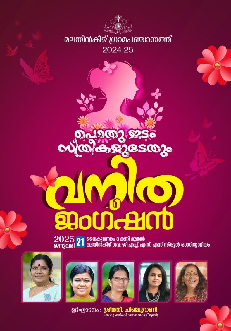 മലയിന്കീഴ് ഗ്രാമപഞ്ചായത്ത് പ്രസിഡന്റ് എ.വല്സലകുമാരി, മാതൃഭൂമി വാര്ത്താ അവതാരക മാതു, നിരീക്ഷണ വിമന്സ് തിയേറ്റര് സ്ഥാപക ഡയറക്ടര് സുധി ദേവയാനി, വനിതാശിശുവികസനവകുപ്പ് ജില്ലാഓഫീസര് തസ്നീം, വനിതാശിശുവികസനവകുപ്പ് ജില്ലാ പ്രോഗ്രാം ഓഫീസര് കവിതാറാണി രഞ്ജിത്ത്, വാര്ഡ് അംഗങ്ങളായ ഒ.ജി.ബിന്ദു, കൃഷ്ണപ്രിയ കെ.എസ്, സിന്ധുരാജേന്ദ്രന്, കുമാരിശാന്ത.ബി.എന്, എല്.അനിത, രജിത, ലക്ഷ്മി, ഷിജിചന്ദ്ര, കെ.അജിതകുമാരി, സി.ഡി.എസ്.ചെയര്പേഴ്സണ് ആര്.കെ.സിന്ധു, സി.ഡി.പി.ഒ, ഹേമ.പി, ഐ.സി.ഡി.എസ്.സൂപ്പര്വൈസര് സനിത, കമ്യൂണിറ്റിവിമന് ഫെസിലിറ്റേറ്റര് ലക്ഷ്മി ശാന്തന്, അഞ്ജന കമലന് എന്നിവര് സംസാരിക്കും. തുടര്ന്ന് വിവിധകലാപരിപാടികള് നടക്കും. വനിതകളുടെ രാത്രിനടത്തത്തോടെ പരിപാടി സമാപിക്കും. വനിതാ ജങ്ഷന് പരിപാടിയോടനുബന്ധിച്ചുള്ള വിളംബര ജാഥ ഇന്ന് വൈകിട്ട് മൂന്ന് മണിക്ക് നടക്കും.