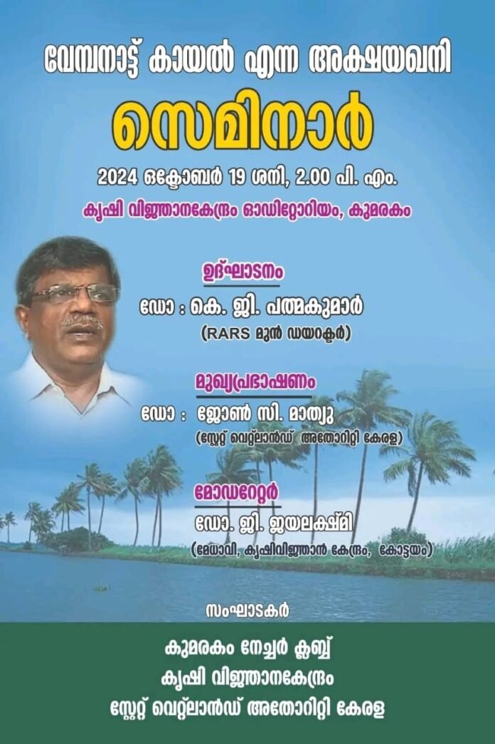 കുമരകം: വേമ്പനാട്ടുകായൽ സംരക്ഷണം അനിവാര്യമായി നിൽക്കുന്ന സാഹചര്യത്തിൽ അതിൻ്റെ ശാസ്ത്രീയ വശങ്ങൾ ചർച്ച ചെയ്യുന്നതിനായി കുമരകം നേച്ചർ ക്ലബ്ബ് ഒരു അക്കാദമിക തല സെമിനാർ സംഘടിപ്പിക്കുന്നു. വേമ്പനാട്ടുകായലിൻ്റെ ആഴവും, ഉപരിതലത്തിലെ പ്ലാസ്റ്റിക് മാലിന്യവും , ജലജീവികളുടെ ആവാസ വ്യവസ്ഥയും അതീവ ശ്രദ്ധയോടെ ചർച്ച ചെയ്യപ്പെടേണ്ട വിഷയമാണ്. ഇക്കാര്യത്തിൽ അഭിപ്രായം പറയാൻ താല്പര്യമുള്ളവർക്കും, വേമ്പനാട്ടുകായൽ സംരക്ഷണം ആഗ്രഹിക്കുന്നവർക്കും ഈ സെമിനാറിൽ പങ്കെടുക്കാം.