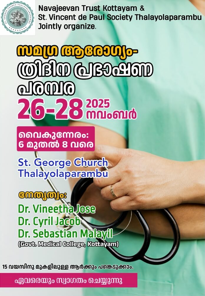 തലയോലപ്പറമ്പ് : ചെറുപ്പക്കാർ പലരും പെട്ടെന്ന് കുഴഞ്ഞു വീണു മരിക്കുന്നതു പതിവാകുന്നതും, ക്യാൻസർ പടർന്നു പിടിക്കുന്നതും, അസ്ഥി – നാഡീരോഗങ്ങൾ വർധിച്ചുവരുന്നതും, ഡയാലിസിസ് ചെയ്യുന്നവരുടെ എണ്ണം വർധിക്കുന്നതുമെല്ലാം ഈ തലമുറയുടെ ആരോഗ്യം തകരാറിലാകുന്നതിന്റെ തെളിവാണ്. പി. യു. തോമസ് നേതൃത്വം നൽകുന്ന കോട്ടയം നവജീവൻ ട്രസ്റ്റും തലയോലപ്പറമ്പ് സെന്റ് വിൻസെന്റ് ഡി പോൾ സൊസൈറ്റിയും ചേർന്ന് നവംബർ 26,27,28 തീയതികളിൽ വൈകിട്ട് 6 മുതൽ 8 മണിവരെ തലയോലപ്പറമ്പ് സെന്റ് ജോർജ് പള്ളിയിൽ വച്ചു ത്രിദിന പ്രഭാഷണ പരമ്പര സംഘടിപ്പിക്കുന്നു.